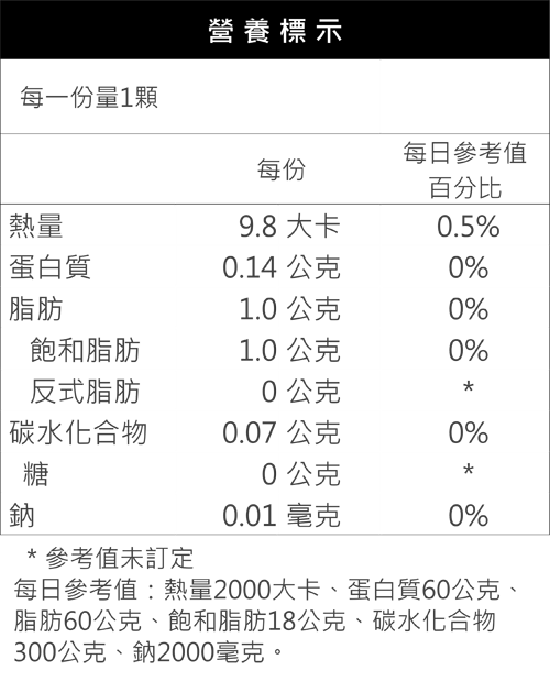 魚油500毫克提供85%OMEGA-3脂肪酸(含48%EPA 240毫克、32%DHA 160毫克、3.5%DPA 17.5毫克)、維生素E (抗氧化劑)20IU |