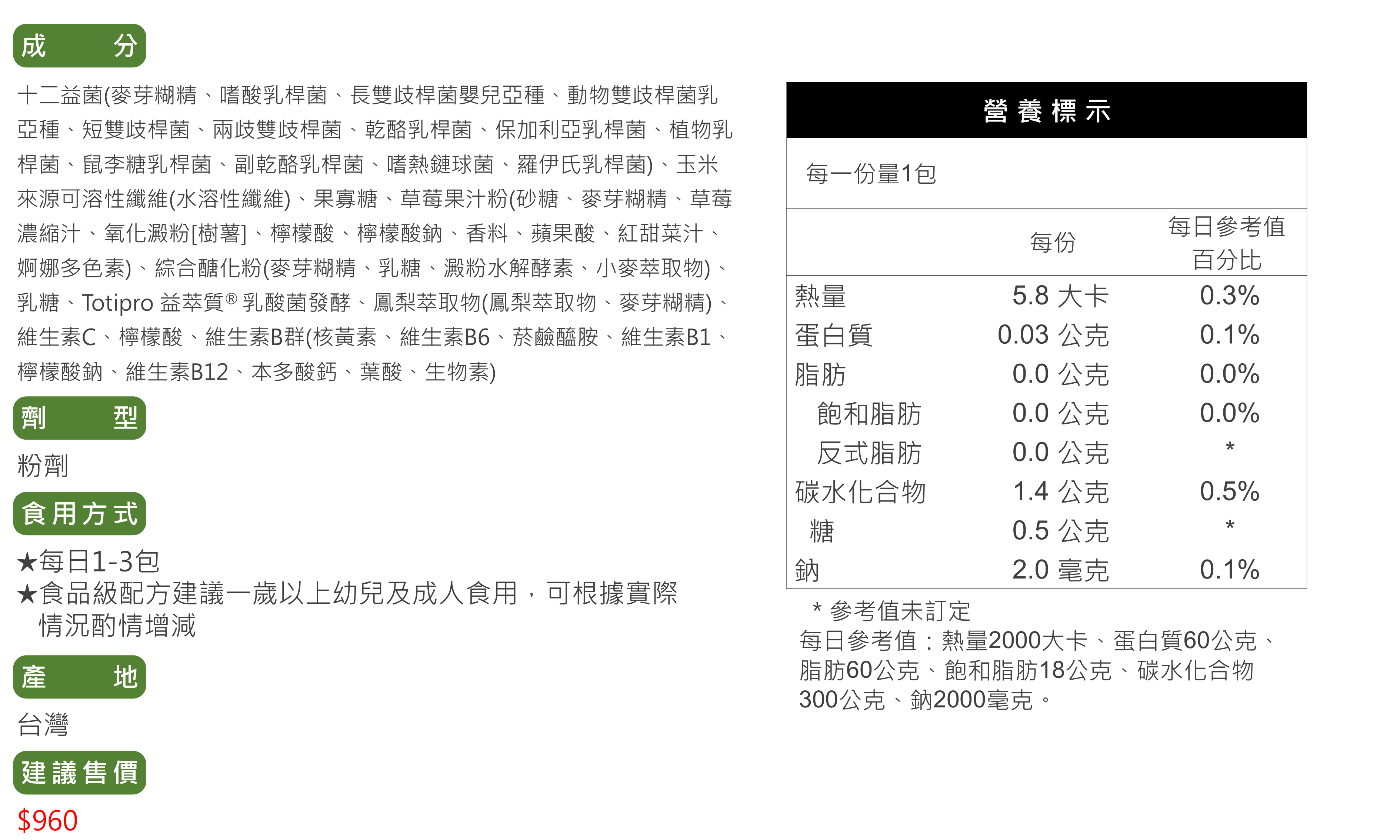 ◆ 十二益菌、益生元、益萃質(Totipro)、專利包埋技術