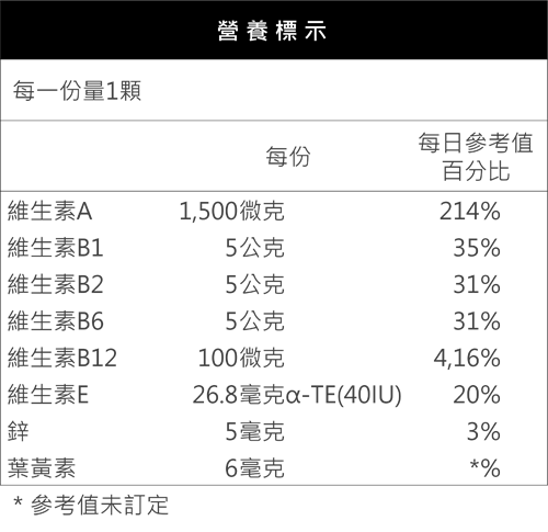 大豆油、山桑萃取、小米萃取、葉黃素(金盞花萃取物20%)、維生素E、決明子粉末、番茄萃取、蜜蠟、硫酸鋅、β胡蘿蔔素、葡萄籽油、維生素B1、 維生素B2、維生素B6、合成玉米黃素、大豆卵磷脂、維生素12 軟膠囊 每日1-2顆 存放陰涼處,避免陽光直射 美國 $1,200 本文圖片來源:pixabay