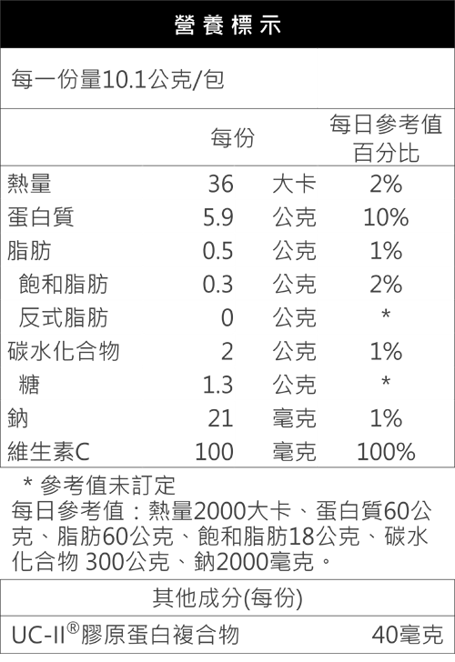 專利水解膠原蛋白、紐西蘭全脂奶粉、鳳梨酵素、AGILIROSE®專利玫瑰果 (玫瑰果萃取、膠原蛋白)、葡萄糖胺鹽酸鹽、鯊魚軟骨、薑黃複合萃取物、維生素C、UC-II®膠原蛋白複合物(含非變性二型膠原蛋白) (雞胸軟骨、氯化鉀)、香草香料粉