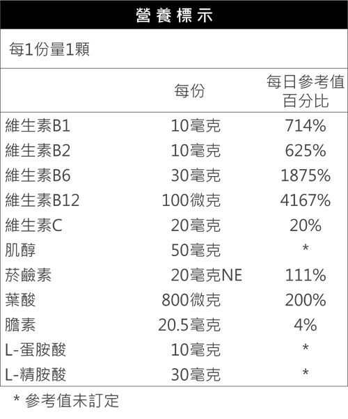 肝精萃取(豬)、十字珍珠草、朝鮮薊萃取、重酒石酸膽鹼、肌醇、維生素B6、L-精胺酸、菸鹼醯胺、大豆卵磷脂、維生素C、洛神花萃取、維生素B1、維生素B2、L-蛋胺酸、牡蠣殼粉、葉酸、維生素B12 軟膠囊 每次1顆,飯後食用 本產品含大豆卵磷脂及牡蠣殼粉 美國