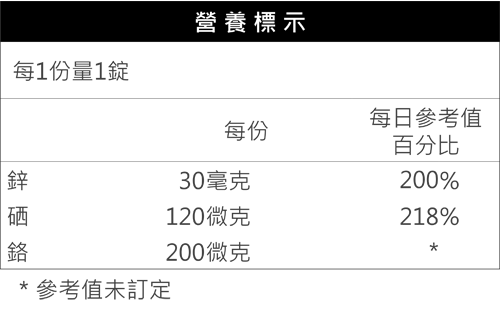鉻酵母、硒酵母、甘胺酸鋅、微結晶狀α-纖維素、阿拉伯膠、羥丙基甲基纖維素(羥丙基甲基纖維素、水、氯化鈉)、聚乙烯吡咯烷酮、硬脂酸鎂、二氧化矽、聚乙二醇(聚乙二醇、二丁基羥基甲苯)、二氧化鈦、滑石粉 錠劑 每日1次,每次1錠 請存放於陰涼處,避免陽光直射 台灣