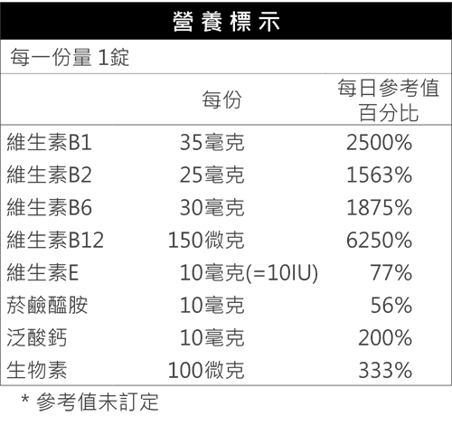微結晶纖維素、羥丙基甲基纖維素、硬脂酸、維生素B1、維生素B6、二氧化矽、維生素B2、硬脂酸鎂、貓爪藤萃取物、阿拉伯膠、麥芽糖、泛酸鈣、菸鹼醯胺、γ-穀維素、維生素E、蟲膠、棕櫚蠟、二氧化鈦、維生素B12、生物素 錠劑 每日1錠 開封後,請置於陰涼處 日本 $1,440 本文圖片來源:pixabay